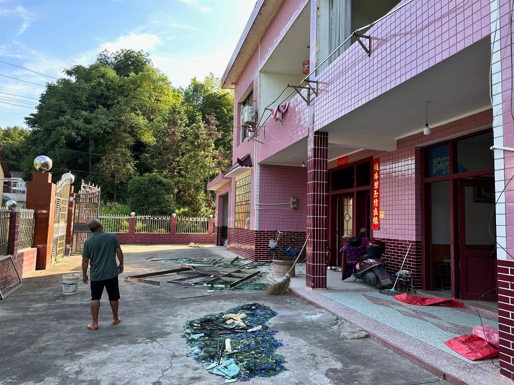 11日,村民正在清理受损的门窗。(新华社记者 谢奔 摄)